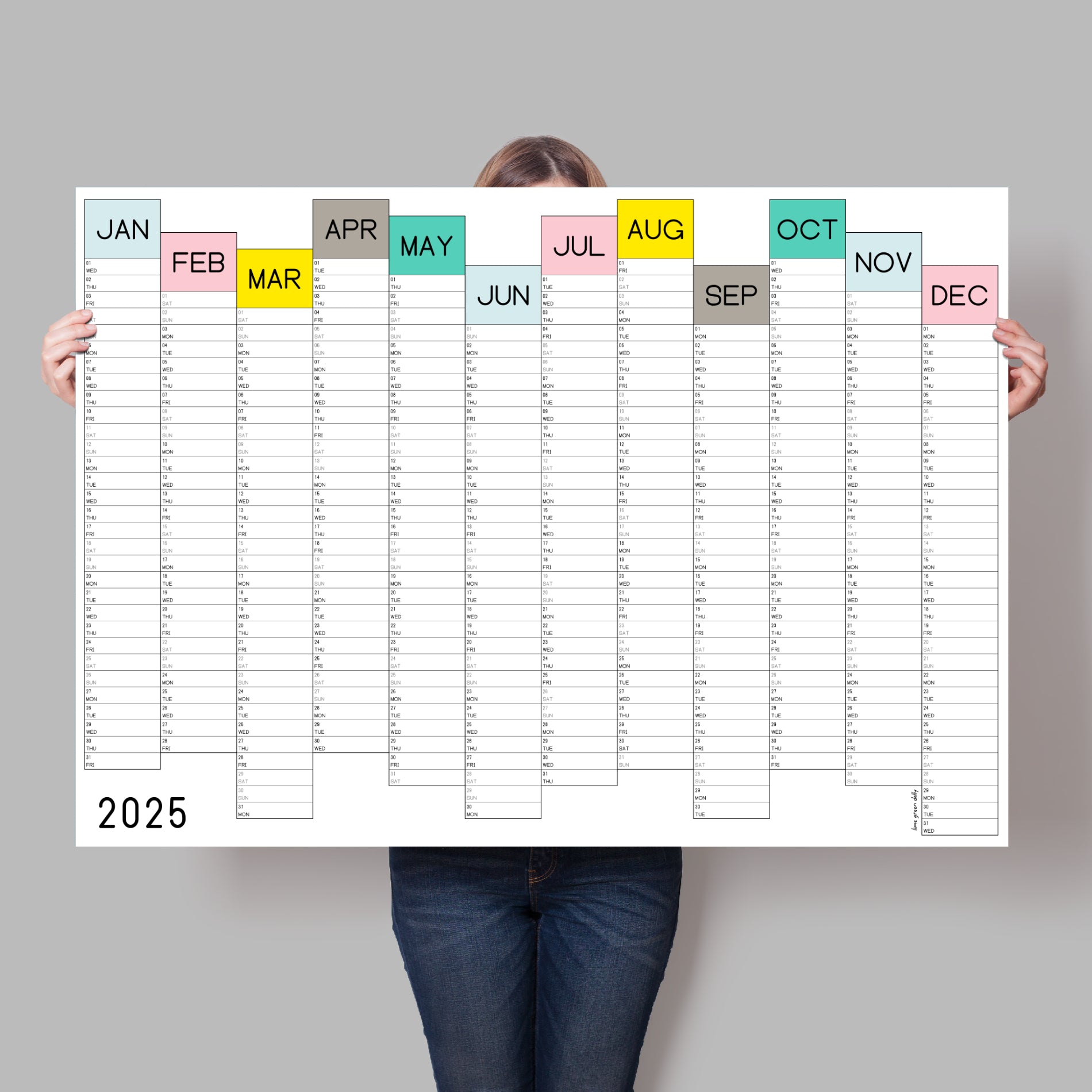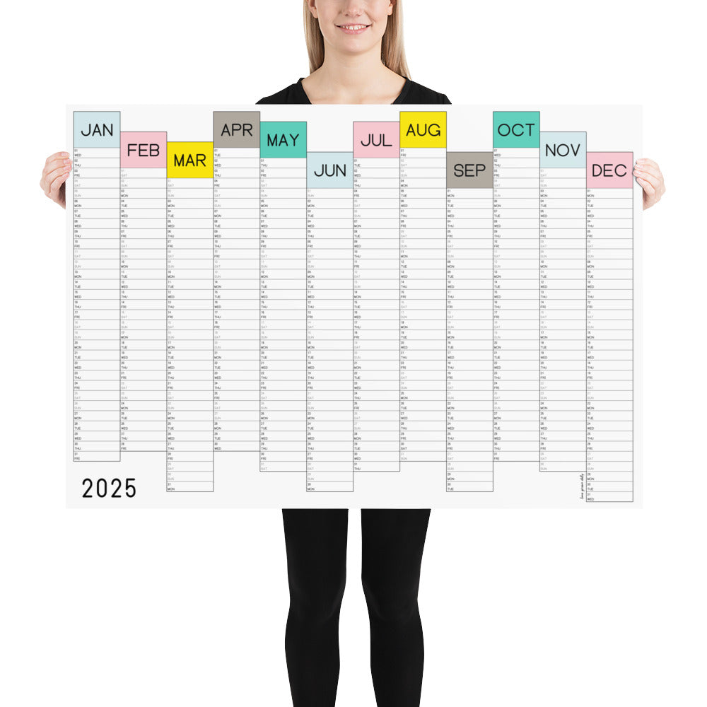 The planner runs from January 1st to December 31st, 2025. It is A0 size (118.9 x 84.1 cm) in a horizontal format and printed on thick durable card.
