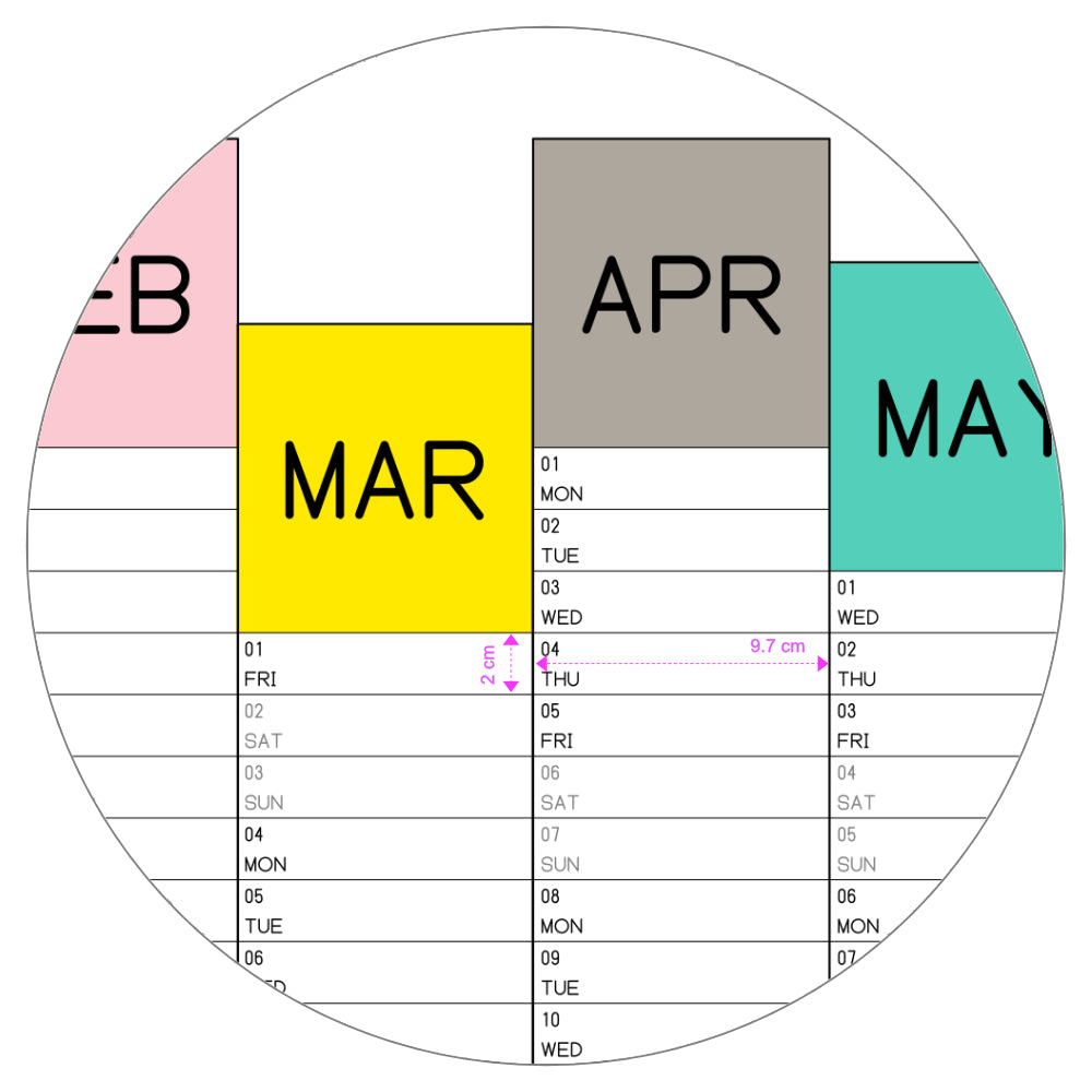 Work with pens, pencils, crayons, washi tape, sticky notes; all up to you how you want to use it. A great visual aid where you can block out periods of time and have the satisfaction of crossing off days as you countdown to an event or mark progress on a project!