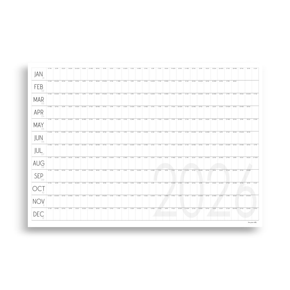 An extra large wall planner for the minimalist at heart. This paper planner is for the year 2026 with blank spaces for you to input your dates, plans, appointments, birthdays and the like. Pens, pencils, crayons, sticky notes; all up to you how you want to use it.