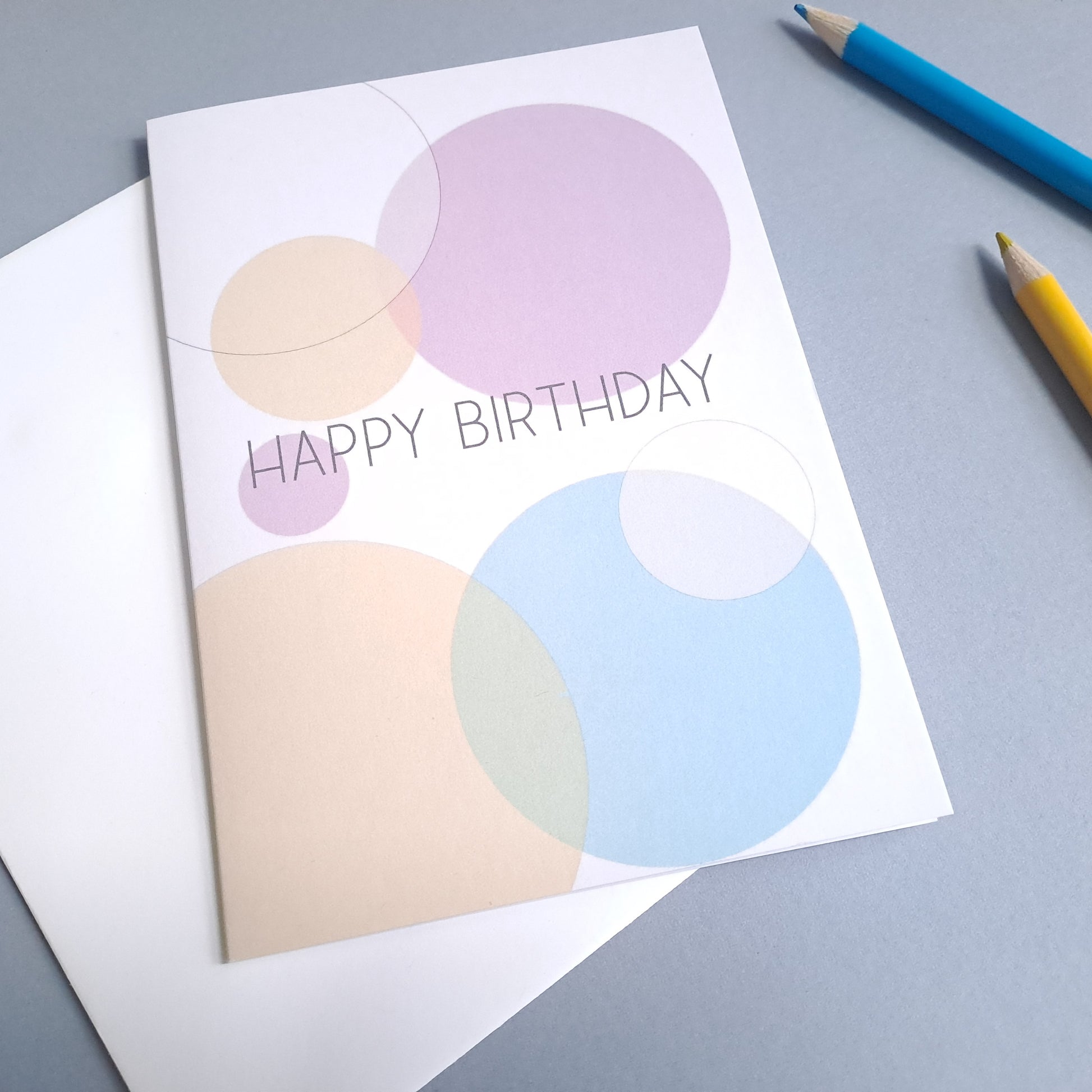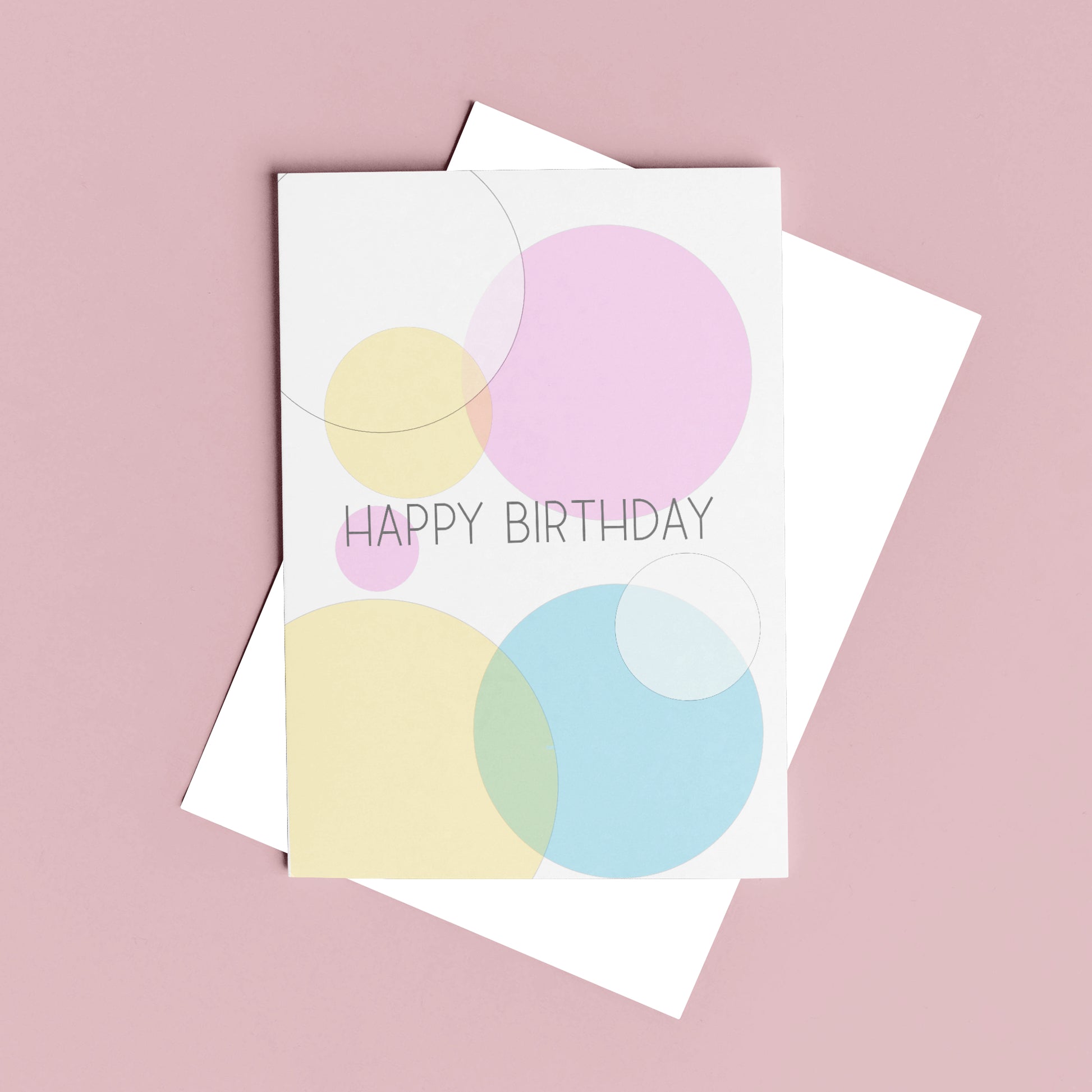 A colourful yet simple 'Happy Birthday' card in soft pastel colours in minimal geometric shapes.